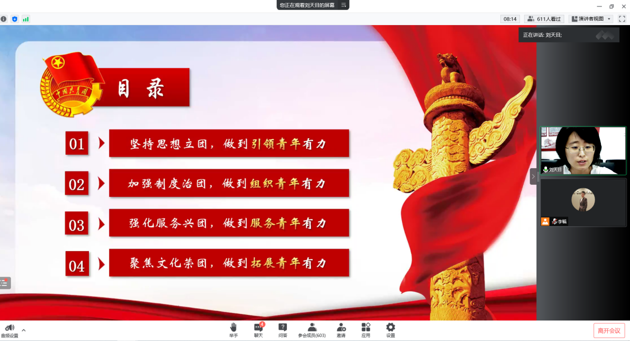 为加强2022级新生的共青团团员意识,深化共青团情怀,增进对党和团的认识,威廉希尔williamhill中文团委书记刘天目老师于2022年8月30日通过腾讯会议为2022级新生举办了“以青春之名,续写时代华章”的线上主题团课活动。