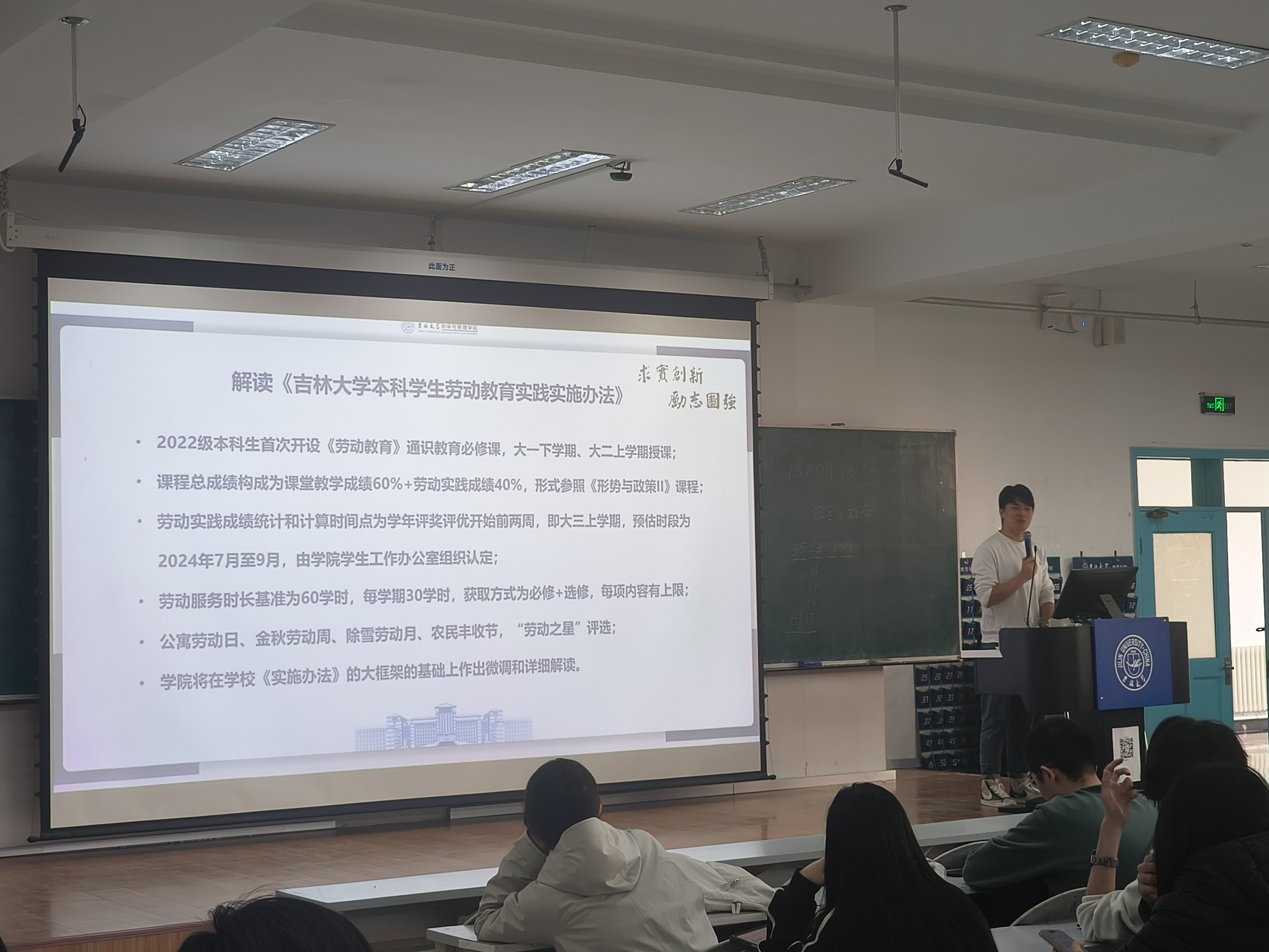 最后,辅导员罗小杰老师向同学们强调了寝室安全的重要性。并传达了选课以及有关期中考试的通知。罗老师对2023级同学们强调考试不能作弊。接着,罗老师为大家解读了《威廉希尔WilliamHill官方网站本科生劳动教育实践实施办法》,说明了关于老员工医保的重要事项。最后,罗老师以请假、防诈骗、挂科同学自习状况等事项表达了对同学们的关心,祝愿同学们身心健康,取得佳绩。