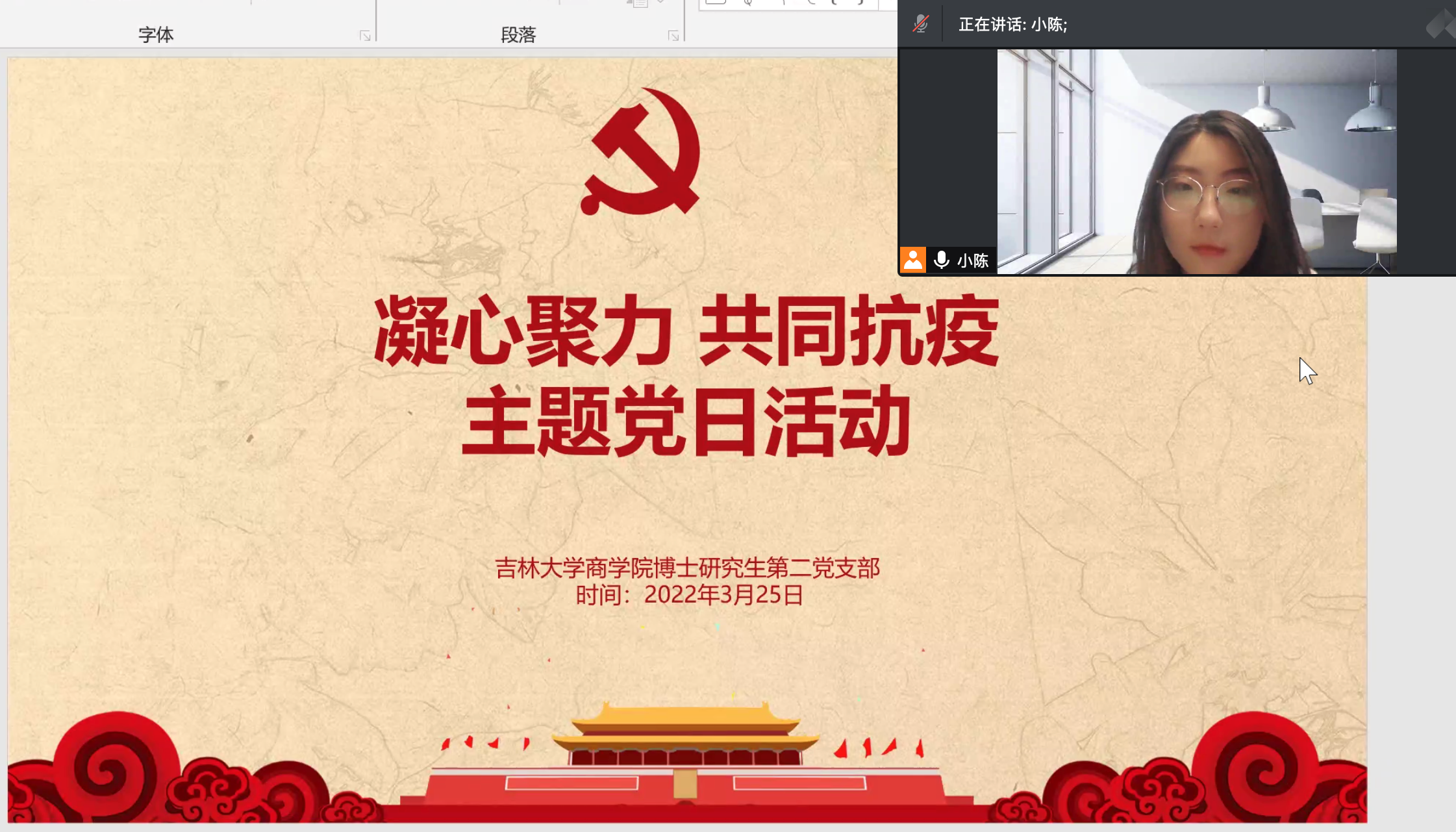 2022年3月25日晚,威廉希尔williamhill中文博士研究生第二党支部抗疫主题党日活动在腾讯会议顺利展开,活动由博士二支部的正式党员、预备党员、入党积极分子和入党申请人共同参与,党支部书记陈婉莹主持。